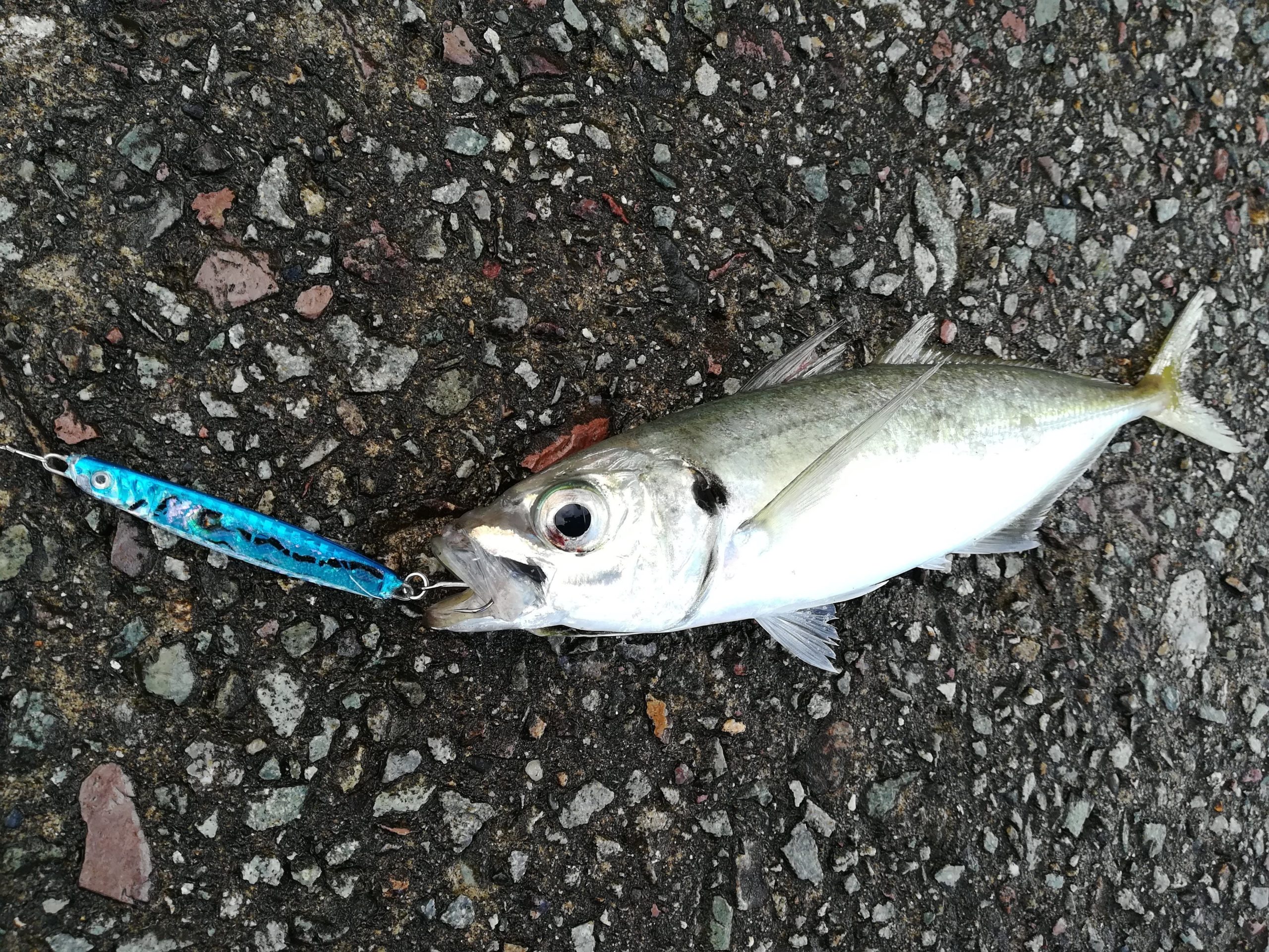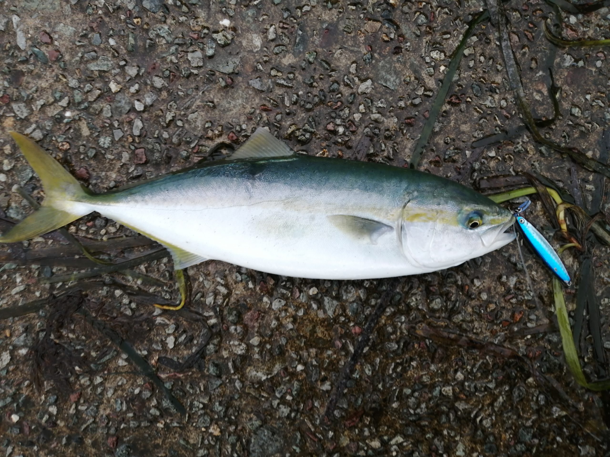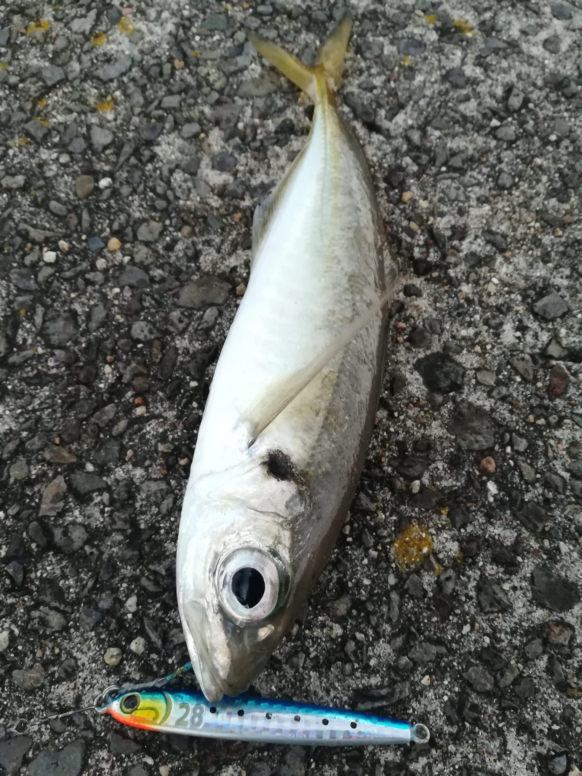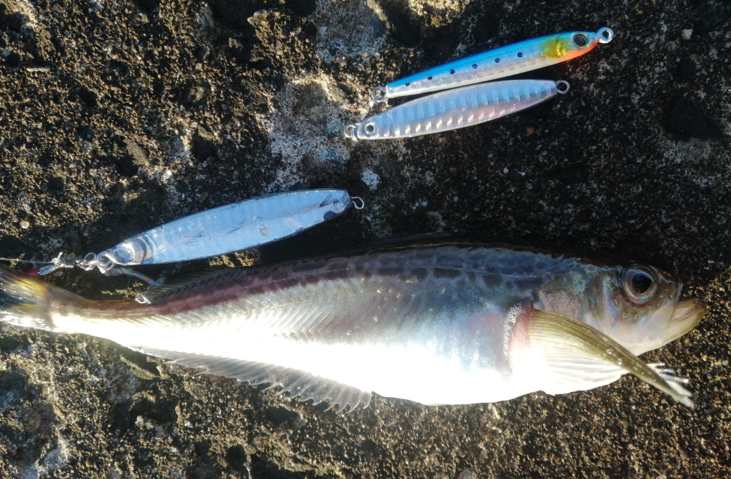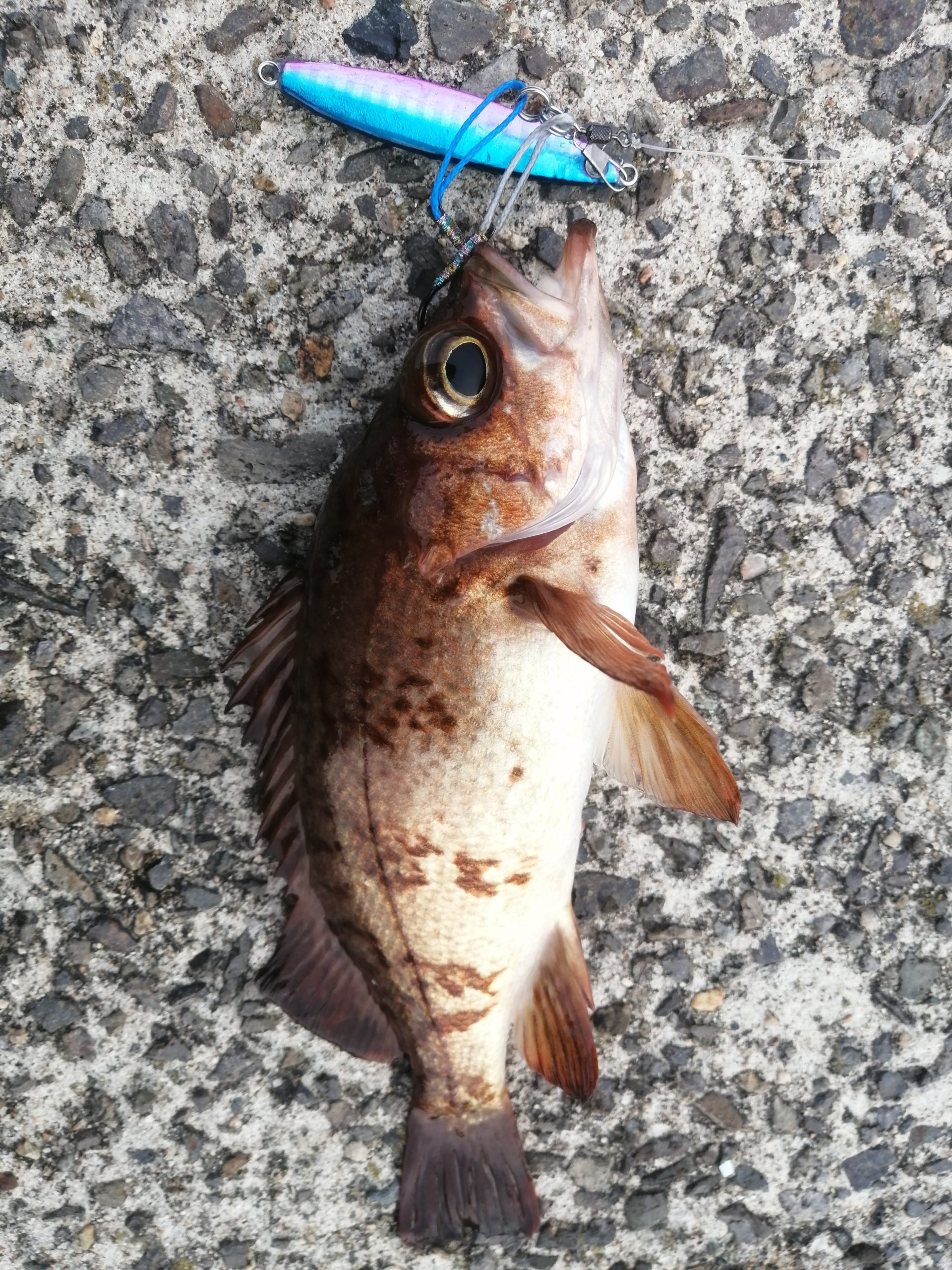 漁港内の沈み根に向かってキャストし、ボトム着底後すぐにリフト&フォールを開始し、2~3回目のフォールでヒット。
