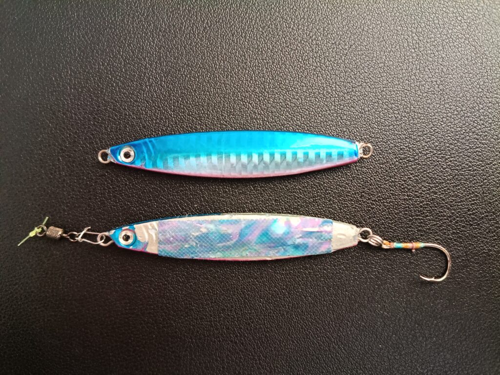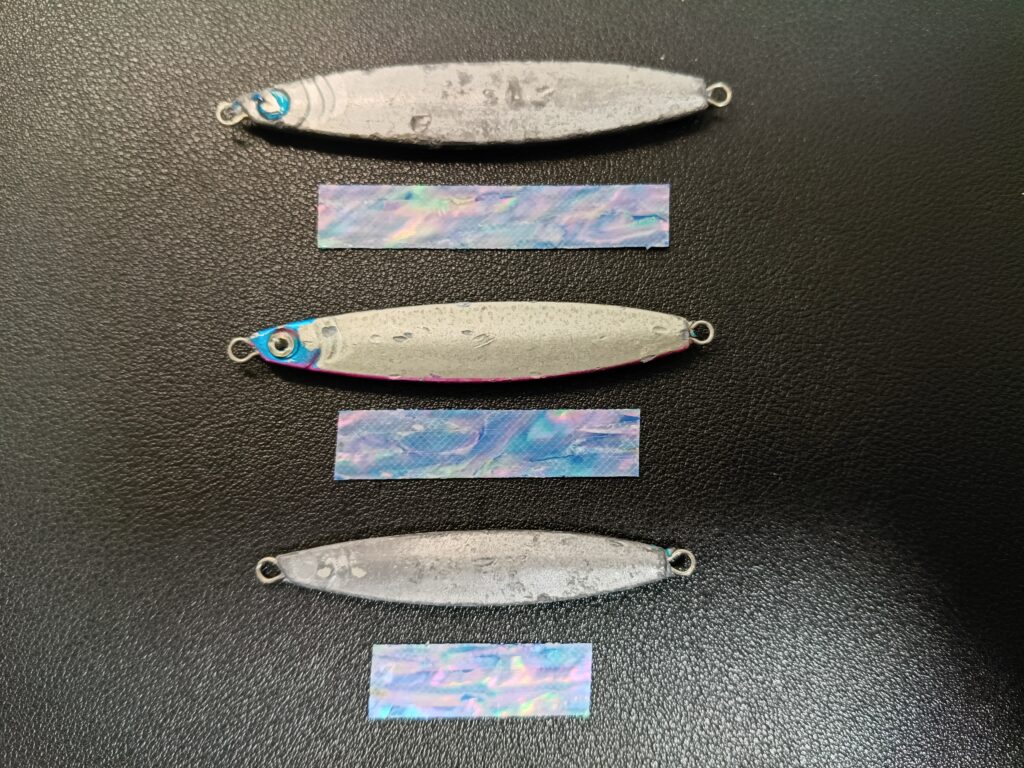 ジグの塗装面の上から貼っても良いですが、塗装が剥がれるとせっかく貼ったアワビシールも剥がれてしまうので、使い倒して塗装が剥がれた剥き出しのジグに貼るのがおすすめです。