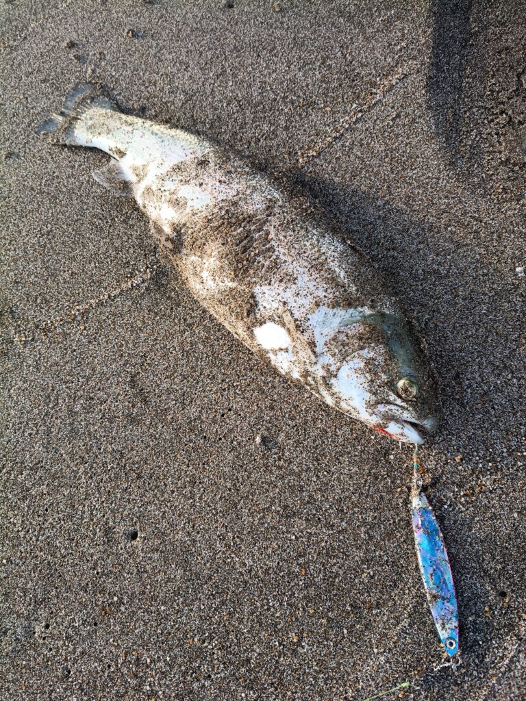 サーフにて、ただ巻き+弱いトウイッチで誘いを入れるとヒットしました。